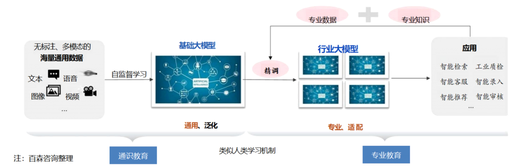 - 基础大模型,也称为通用大模型,是通过基于海量通用数据进行预训练而得到的。其优点在于拥有强大的泛化能力。基础大模型通常利用大算力和拥有大量参数的深度学习算法,在大量无标注的通用数据上进行预训练,从而形成能够“举一反三”的泛化能力,相当于AI 完成了“通识教育”。基础大模型将 AI 的开发应用从“小作坊”带入“大工业”时代,但由于缺乏特定场景的语料和数据集的训练及模型调优,因此在特定场景下的“专业度”还有待提高。